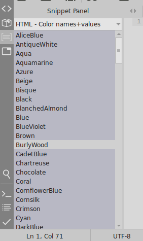 each snippet folder can contain one or more .txt files, in UTF-8 (no BOM) or UTF-16 (with BOM) encoding. files have snippet per line, in the form "name=value" or simply "name" (if value missed, it equals to name).