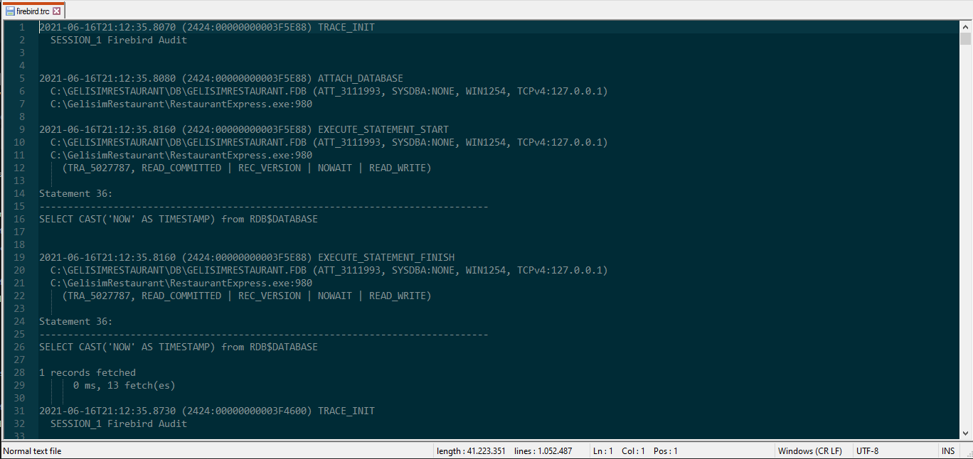 I have no problem opening firebird.trc file on Notepad++ (See attached picture). Indeed, there are some non printable characters in that file around line 6365, 6378. Probably bad saved data in database or something like that saved in trace file.