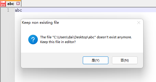 I think when an opened file is modified or removed from outside CudaText, it should warn users immediately after the users try to activate the non-existing window (or Tab). In my case, CudaText can suggest me to close the non-existing file.