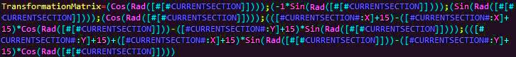 TransformationMatrix=(Cos(Rad([#[#CURRENTSECTION]])));(-1*Sin(Rad([#[#CURRENTSECTION]])));(Sin(Rad([#[#CURRENTSECTION]])));(Cos(Rad([#[#CURRENTSECTION]])));(([#CURRENTSECTION#:X]+15)-([#CURRENTSECTION#:X]+15)*Cos(Rad([#[#CURRENTSECTION]]))-([#CURRENTSECTION#:Y]+15)*Sin(Rad([#[#CURRENTSECTION]])));(([#CURRENTSECTION#:Y]+15)+([#CURRENTSECTION#:X]+15)*Sin(Rad([#[#CURRENTSECTION]]))-([#CURRENTSECTION#:Y]+15)*Cos(Rad([#[#CURRENTSECTION]])))