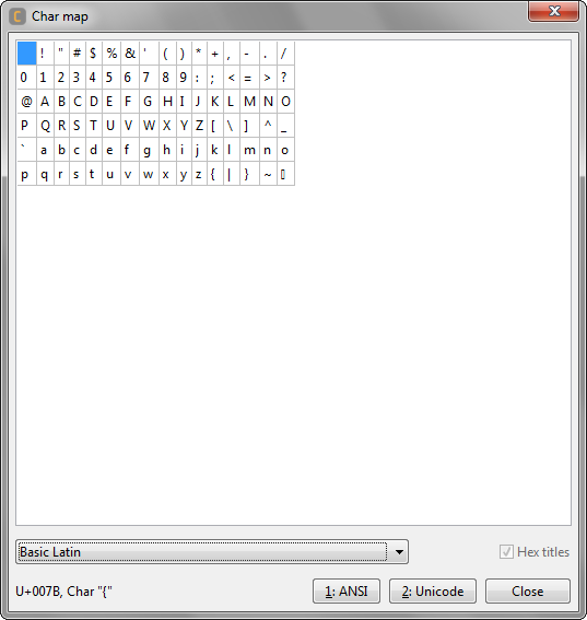 1. В режиме Unicode отображать Unicode name для символа под указателем мыши (например, U+0041 LATIN CAPITAL LETTER A, Char "A").