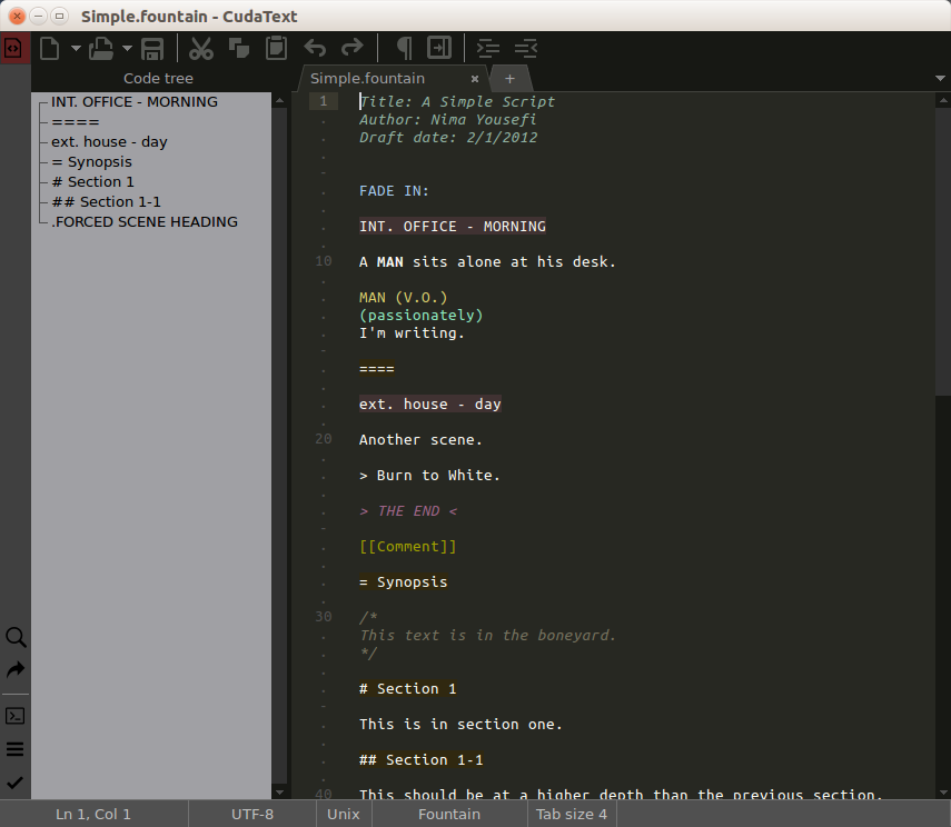 I've used LaTeX since 2004 until I started screenwriting and started using Fountain. The Highland editor is okay but I wanted something that would allow me to expand the language a bit. I tried Emacs and hated the keybindings, tried Spacemacs and loved the Vim keybindings but it was quite klugey so tried out Sublime but it's package for Fountain is incomplete. If someone is willing to work with me, it's pretty simple. The page for it is here: https://fountain.io/