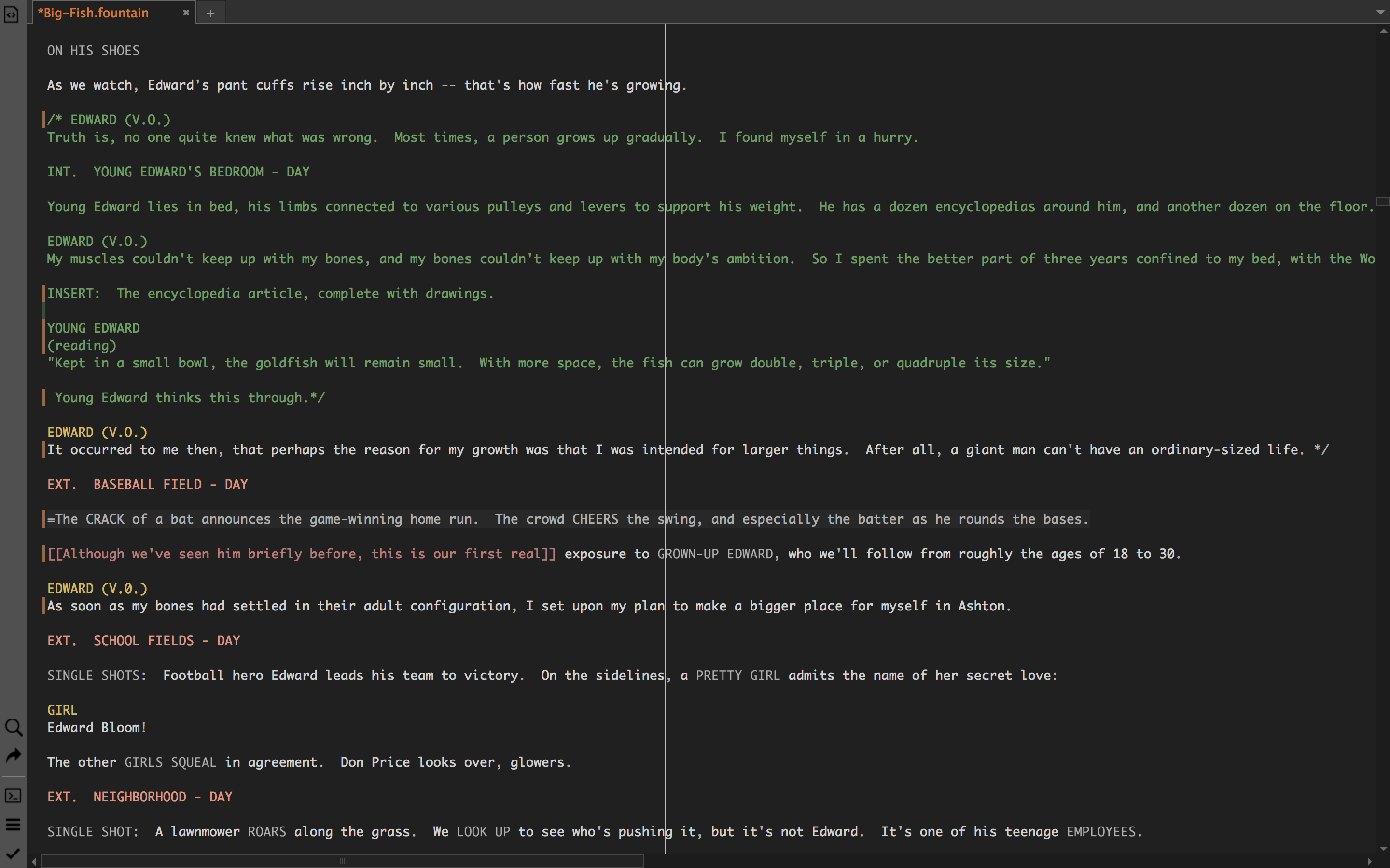 The right flush = commenting they actually consider a "synopsis" command so it's a good colour now for that though the Highland app has it a teal (light blue) https://fountain.io/syntax#section-sections