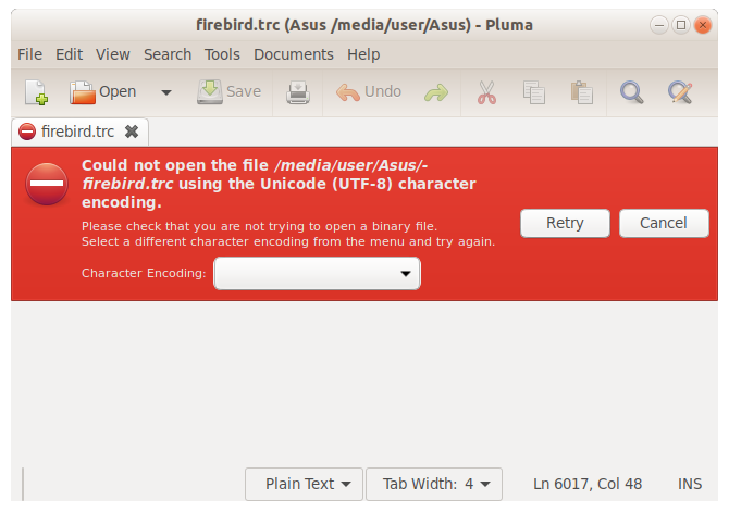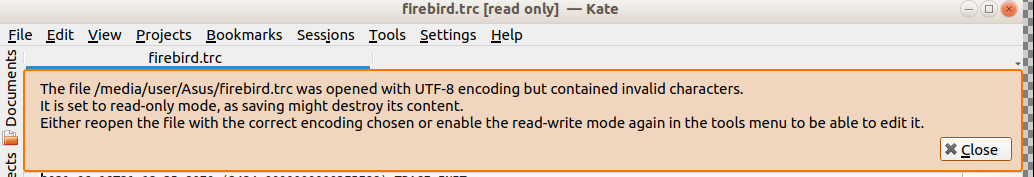 Here you can see non printable characters in that firebird.trc file attached.