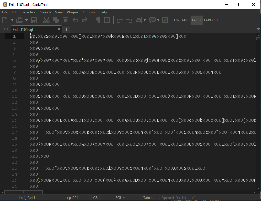 Moreover, I have another bigger SQL file (about 284MB received it today) which is identified as UCS-2 LE BOM by Notepad++ and CudaText still forces cp1254 displays file like hex and I cannot switch to UTF8. I can share that file compressed in earlier mentioned e-mail if needed.