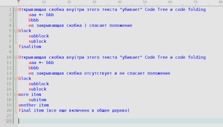 Возникла проблема: без явного указания на то редактор делает еще один "блок", если видит открывающую скобку вида ( { или [.